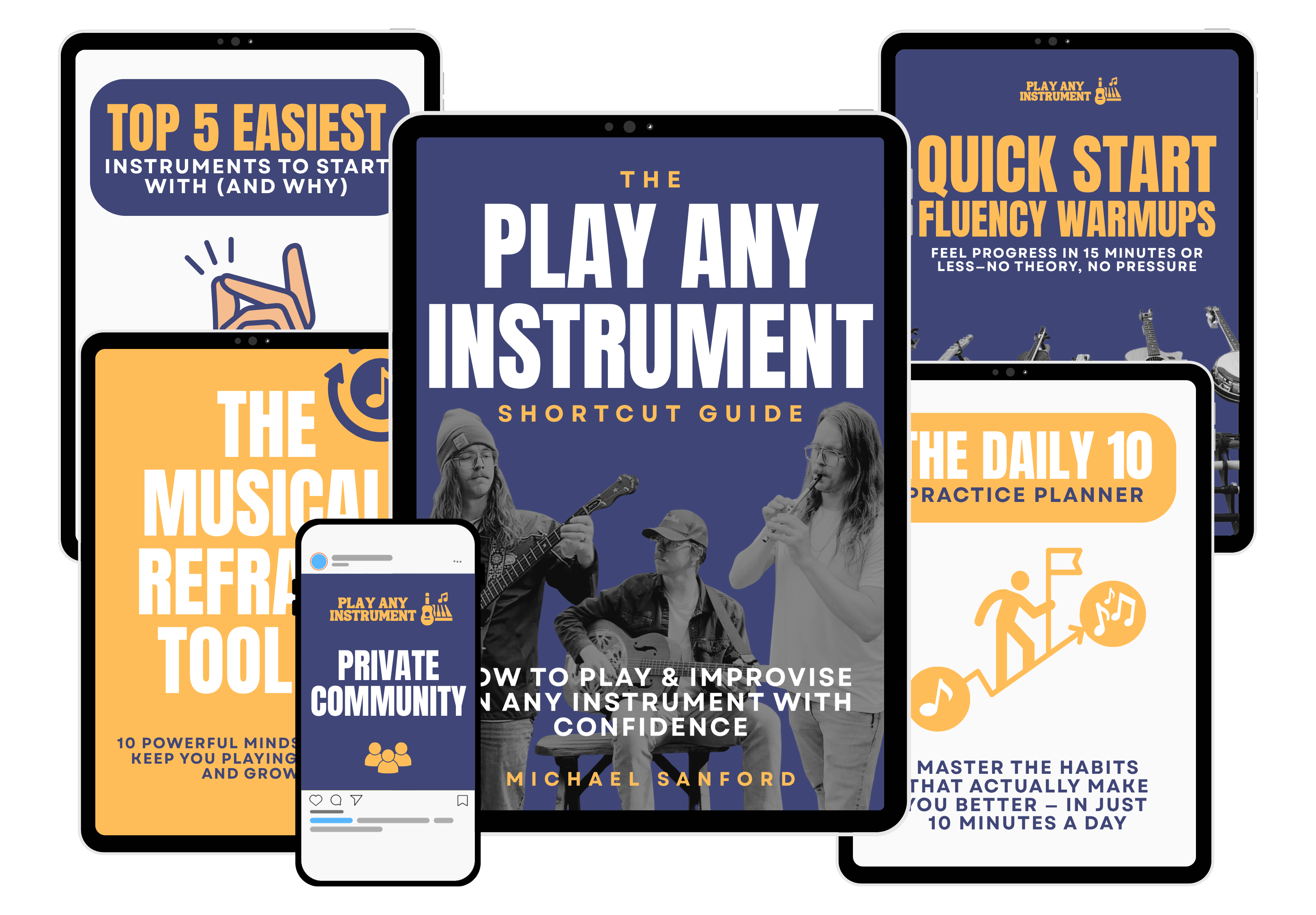 A: This is for anyone who wants to confidently pick up any instrument and actually play—whether you’ve dabbled for years, started and stopped countless times, or never touched an instrument before. If you want to jam, improvise, and enjoy making music without overthinking theory or feeling stuck, this guide is for you.